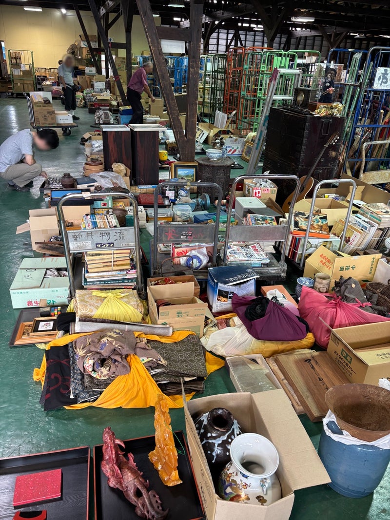 だいぶ暑くなってきましたが、荷物はしっかりと増えております。 この日は梅雨の合間の晴天で、朝から多くの業者様がご来場。季節の変わり目らしく、掛け軸や煎茶道具、陶磁器、昭和の雑貨など多彩なジャンルが並びました。